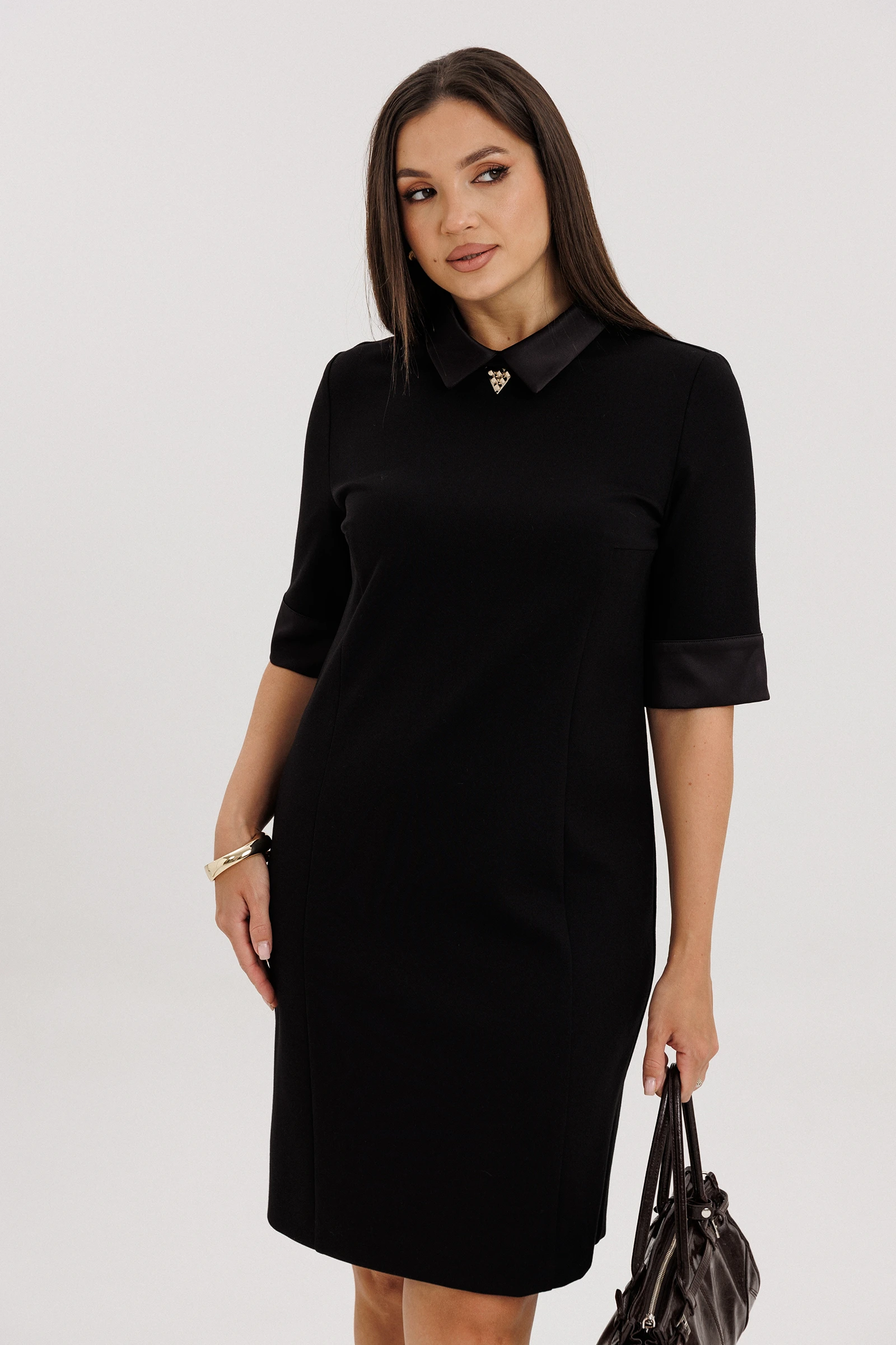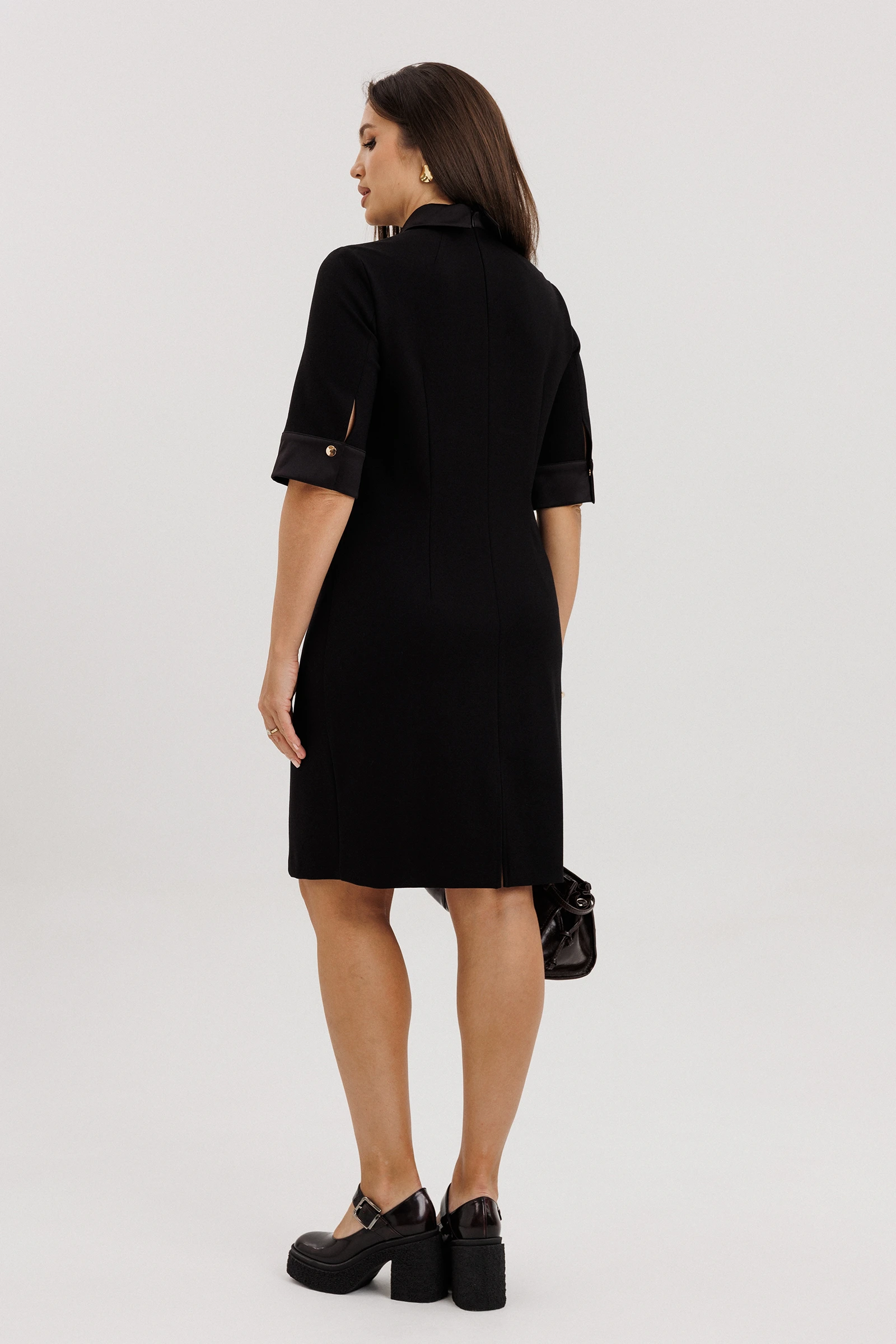 Детали: длина до колена, рукав ¾, строгий воротник с акцентной деталью.