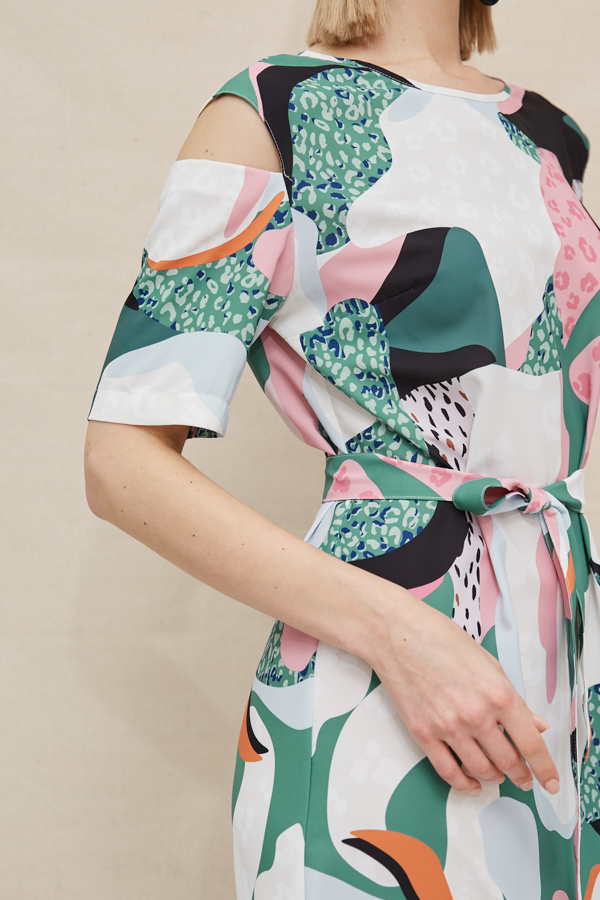 Платье свободного силуэта из плательной ткани. Круглый вырез горловины оформлен косой бейкой. На задней части изделия застежка-пуговица, снизу выполнен разрез. Втачной короткий рукав, с вырезами на плечах. В комплекте пояс из основной ткани.