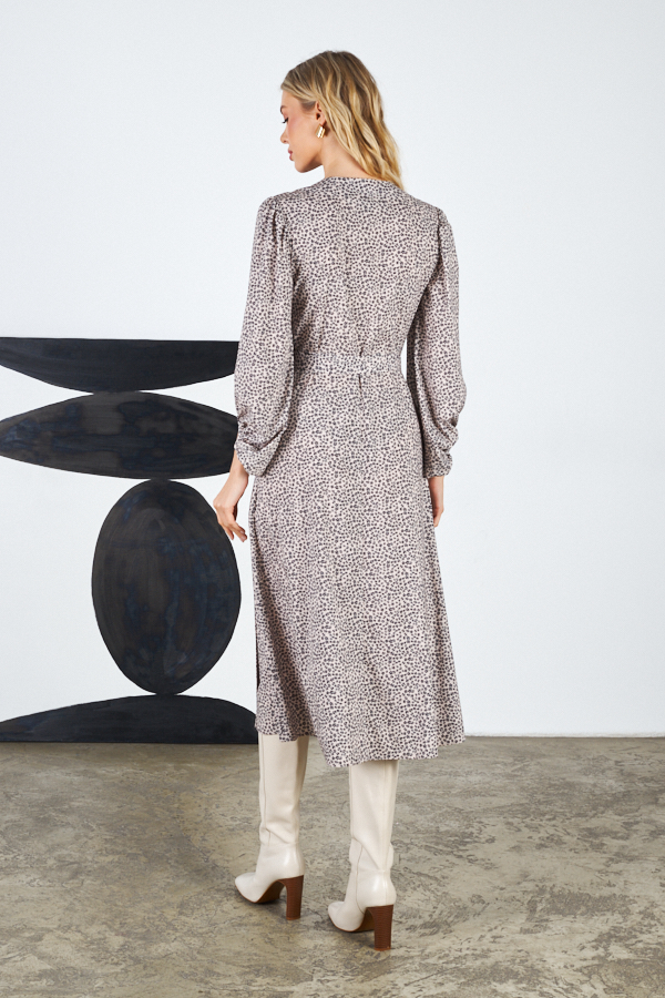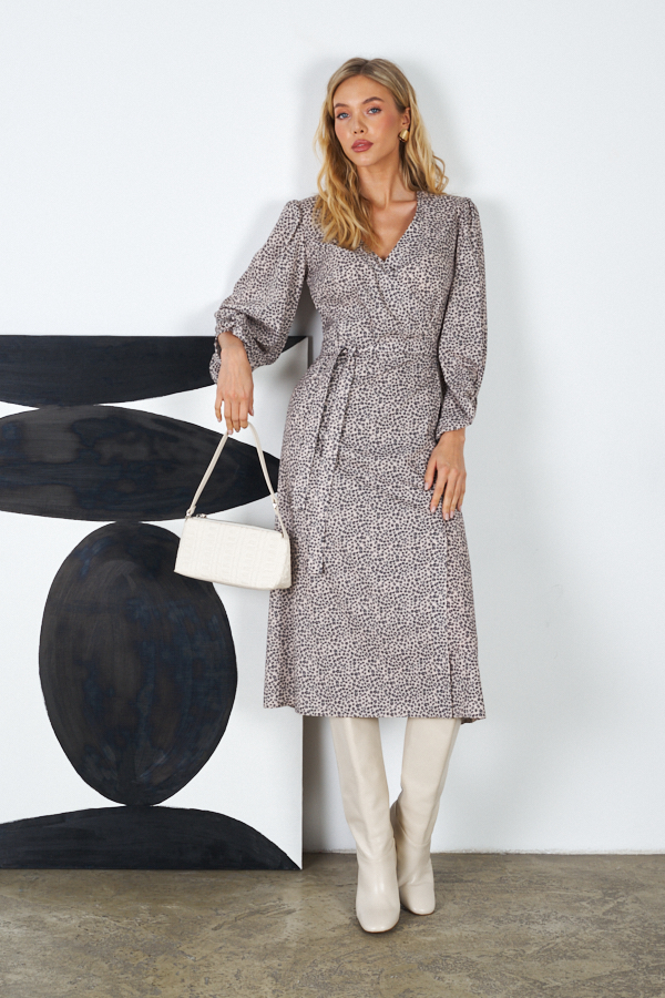 Платье с запахом фиксирующимся притачным поясом выполнено из плательной ткани. Отрезное в области талии. Лиф прилегающий. Юбка летящего силуэта. Фантазийные рукава с асимметричным низом, окантованным бейкой, и сборкой по окату и низу рукава.
