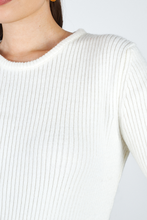 Платье прилегающего силуэта с рисунком в рубчик. Длинный втачной рукав. Круглый вырез горловины оформлен резинкой-бейкой. Изделие выполнено из мягкой пряжи.