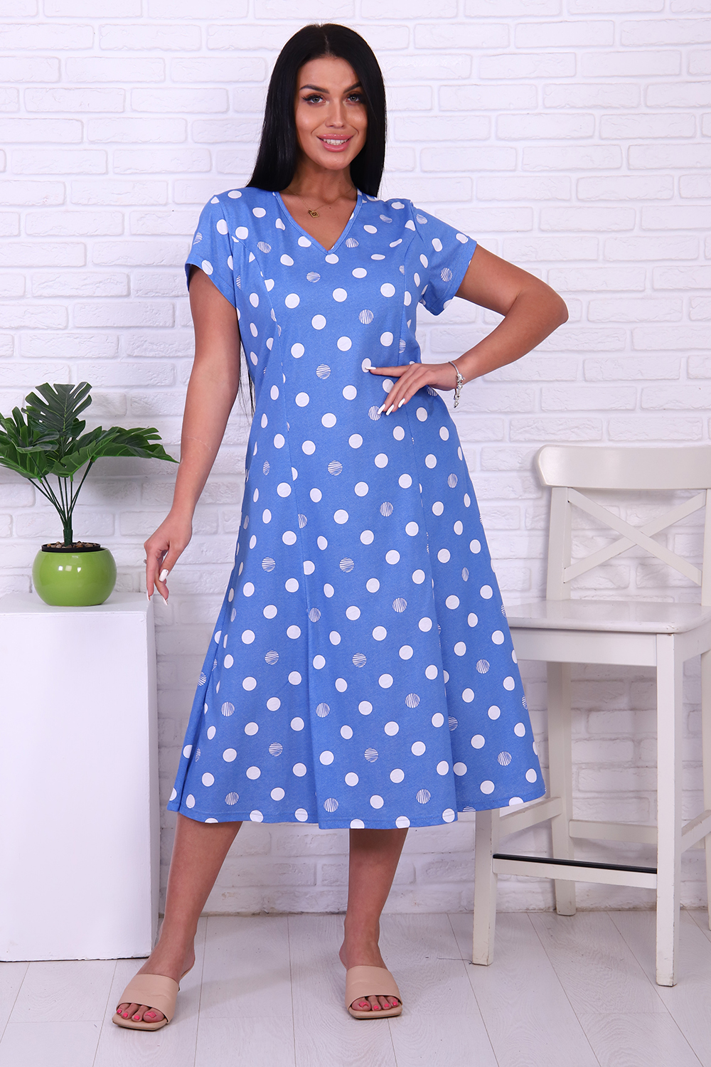 Платье из ткани кулирка расцветка горох. Платье выполнено в легком стиле, с коротким рукавом, горловина V вырезом, в районе талии немного заужено, к низу умеренно расклёшено, что придает платью легкость и элегантность. Подойдет для прогулок, дома, и отдыха.