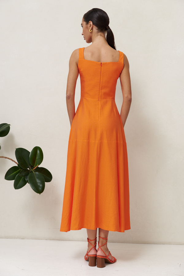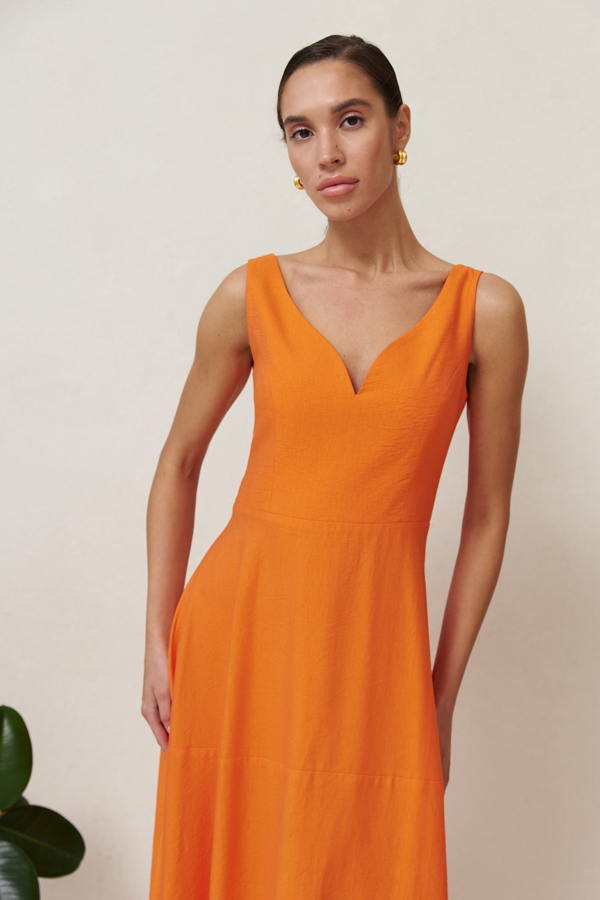 Платье на бретелях, отрезное по линии талии из вискозной ткани с крэш-эффектом. Изделие, прилегающее в области груди и свободное в области бедер. Нижняя часть платья по силуэту колокол с кокеткой. Лиф двухслойный с красивым женственным вырезом и рельефными швами от проймы. По среднему шву спинки застежка-молния.