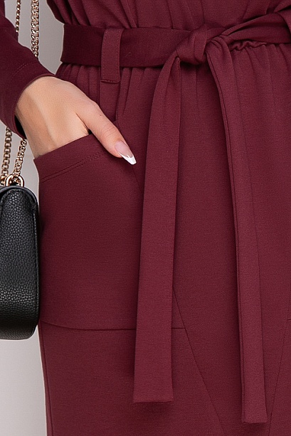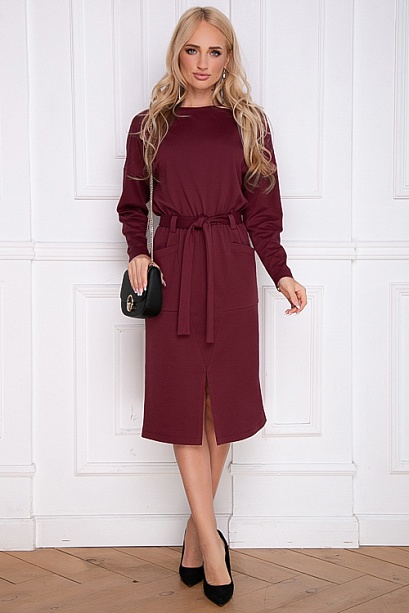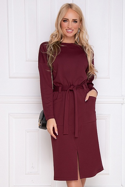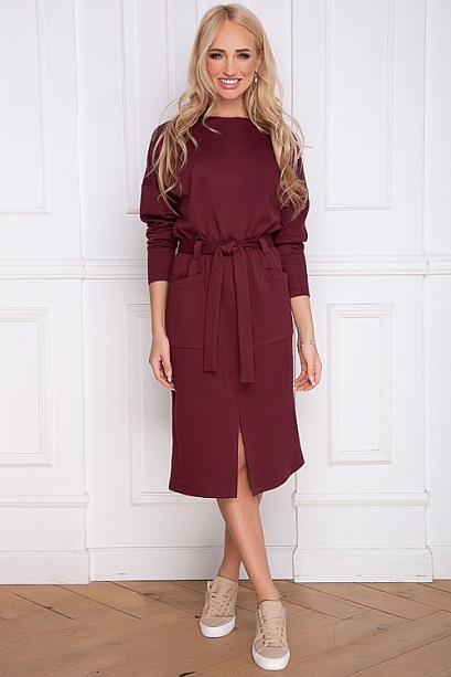 Платье из трикотажного полотна свободного силуэта,горловина "лодочка",плечо спущенное на основе цельнокроеного, отрезное по линии талии с проложенной эластичной лентой,юбка с рельефами и накладными карманами,по центру разрез.Пояс из основной ткани в комплекте.