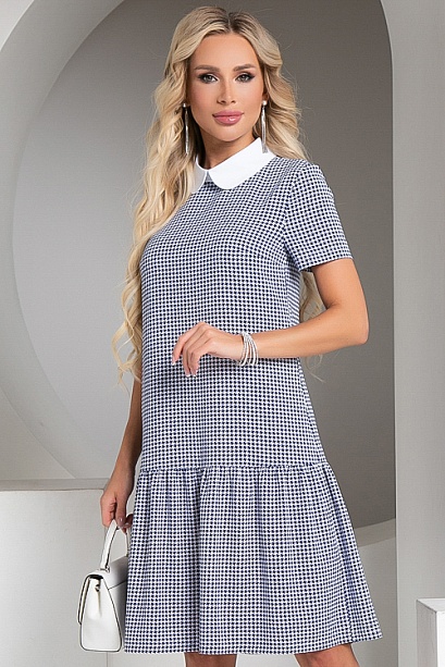 Платье трапецевидного силуэта с притачной оборкой по низу.По горловине воротник стойка из контрастной ткани.