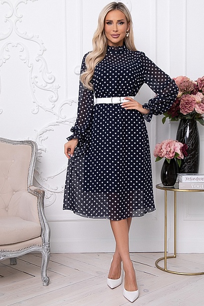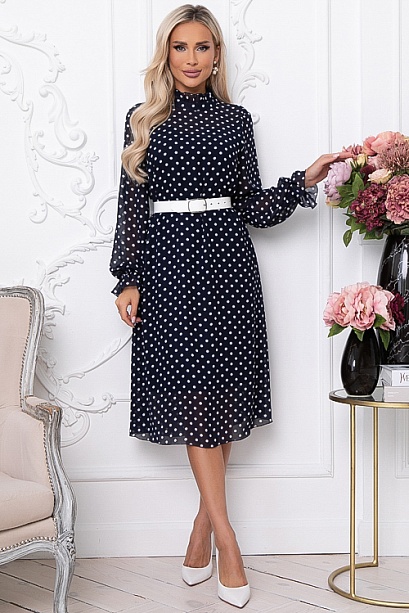 * Платье трапецевидного силуэта из шифона в горох.Ворот стойка с рюшей с застежкой сзади на петли и пуговицы.Изделие посажено на трикотажный подклад.Ремень в комплект не входит.Цвет: т.синий.
