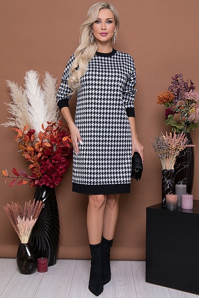 Платье свободного силуэта из жаккардового трикотажного полотна в гусиную лапку,низ изделия,манжеты и горловина отделаны контрастной трикотажной рибаной.Ремень в комплект не входит.
