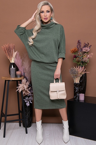 * Платье из мягкого эластичного трикотажного полотна. Лиф платья свободного силуэта, с цельнокроеными рукавами на манжете и воротником "хомут". Юбка прямая, слегка зауженная к низу,по спинке со шлицей. По талии платье зафиксировано на резину. Из верхней части платья формируется глубокий свободный напуск.