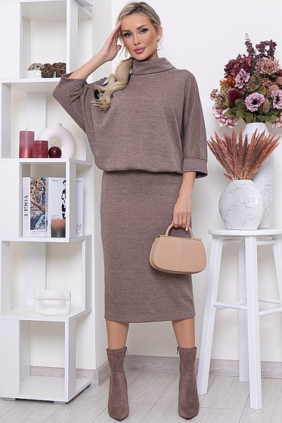 Платье из мягкого эластичного трикотажного полотна.Лиф платья свободного силуэта,с цельнокроеными рукавами на манжете и воротником "хомут".Юбка прямая,слегка зауженная к низу,по спинке со шлицей.По талии платье зафиксировано на резину.Из верхней части платья формируется глубокий свободный напуск.