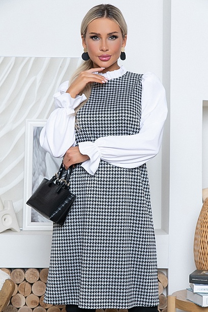 Комбинированное платье из жаккардового трикотажного полотна с рукавами из текстильного полотна и рюшей по горловине. Ремень в комплект не входит.