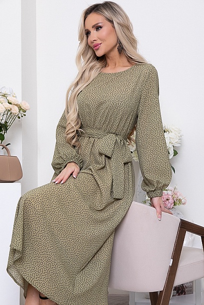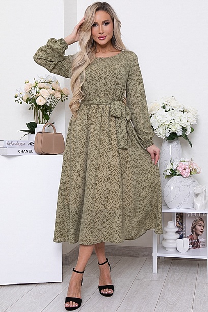 Платье из креп шифона длиной миди,отрезное по линии талии присборено на резину,с расклешенной летящей юбкой на трикотажном подкладе.В комплекте длинный пояс из основной ткани.