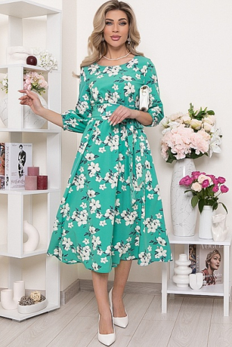 Платье из креп шифона,с красивым запахом по лифу,отрезное по линии талии,присобрано на эластичную резину, с летящей расклешенной юбкой на трикотажном подкладе.Перед юбки с разрезом в  рельефе по ноге.Пояс из основной ткани в комплекте.