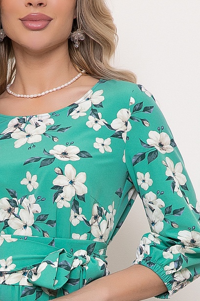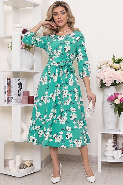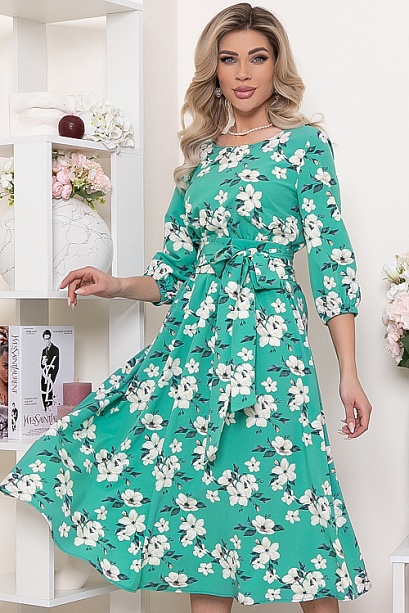 Платье из текстильного полотна,отрезное по линии талии,присобрано на эластичную резину, с летящей расклешенной юбкой и красивым поясом кушак в комплекте.