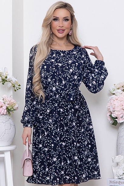 Платье из креп шифона,отрезное по линии талии присборено на резину,с расклешенной летящей юбкой на трикотажном подкладе.В комплекте  пояс из основной ткани.