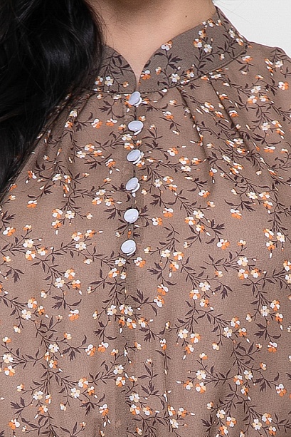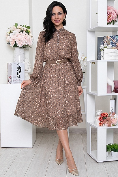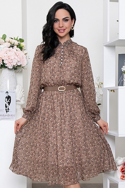 Платье из  шифона,на трикотажном подкладе,отрезное по линии талии присборено на резину,с расклешенной летящей юбкой.Воротник стойка. По переду центральная застежка на навесные петли и пуговицы.Ремень в комплект не входит.