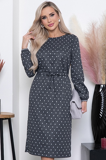 Платье из комфортного жаккардового трикотажного полотна в горох  прямого,свободного силуэта с кулиской по талии.Рукав втачной оканчивающийся эластичными подвязами из трикотажной рибаны.В среднем шве спинки шлица.