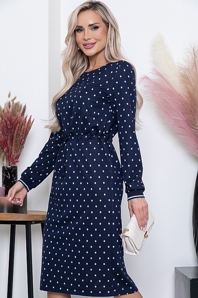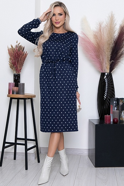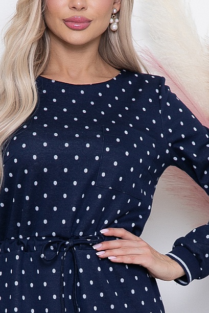 Платье из комфортного жаккардового трикотажного полотна в горох  прямого,свободного силуэта с кулиской по талии.Рукав втачной оканчивающийся эластичными подвязами из трикотажной рибаны.В среднем шве спинки шлица.