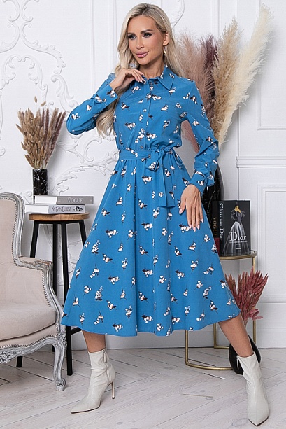 * Платье из текстильного полотна, отрезное по линии  талии, присобрано на эластичную резину. Горловина оформлена отложным воротником на стойке. По полочке-планка до талии с застежкой на петли и пуговицы. Юбка изделия расклешенная и летящая. В комплекте  длинный пояс из основной ткани.