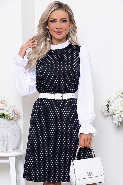 Комбинированное платье из жаккардового трикотажного полотна с рукавами из текстильного полотна и рюшей по горловине. Ремень в комплект не входит.