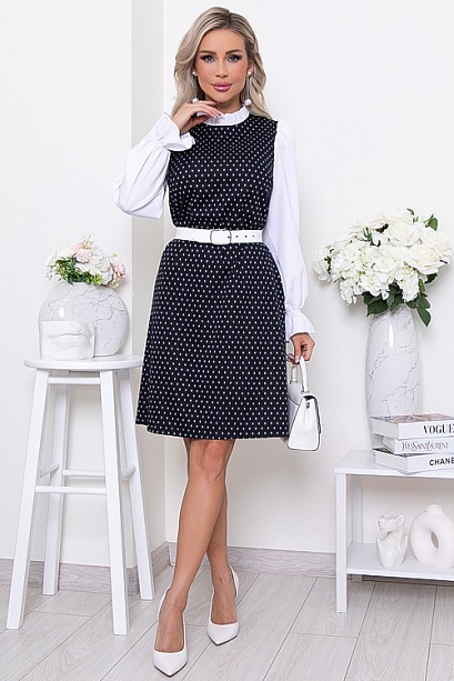Комбинированное платье из жаккардового трикотажного полотна с рукавами из текстильного полотна и рюшей по горловине. Ремень в комплект не входит.
