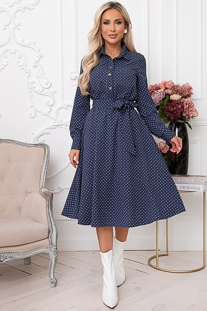 Платье из текстильного полотна,отрезное по линии  талии,присобрано на эластичную резину.Горловина оформлена отложным воротником на стойке.По полочке-планка до талии с застежкой на петли и пуговицы.Юбка изделия расклешенная и летящая.В комплекте  длинный пояс из основной ткани.