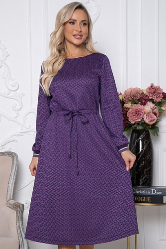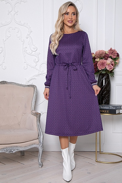 Платье из жаккардового трикотажного полотна,отрезное по линии талии с расклешенной юбкой.Между лифом и юбкой втачена кулиска,которая позволяет регулировать ширину платье по талии.Рукав втачной оканчивающийся трикотажным подвязом.