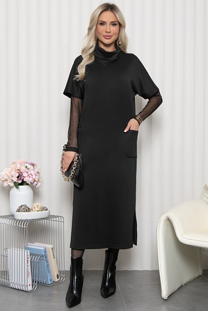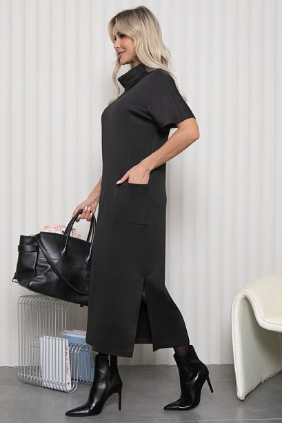 Платье длиной миди из комфортного трикотажного полотна(ткань производство Турция) прямого силуэта с цельнокроеными рукавами,воротником-хомут и удобными накладными карманами.В боковых швах по низу обработаны разрезы.