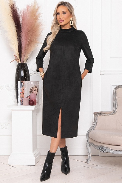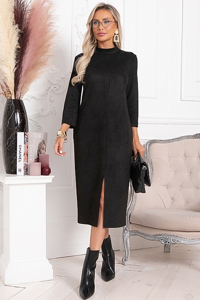 * Платье из экозамши полуприлегающего силуэта, с разрезом по низу. Воротник стойка. В среднем шве спинки потайная молния.
