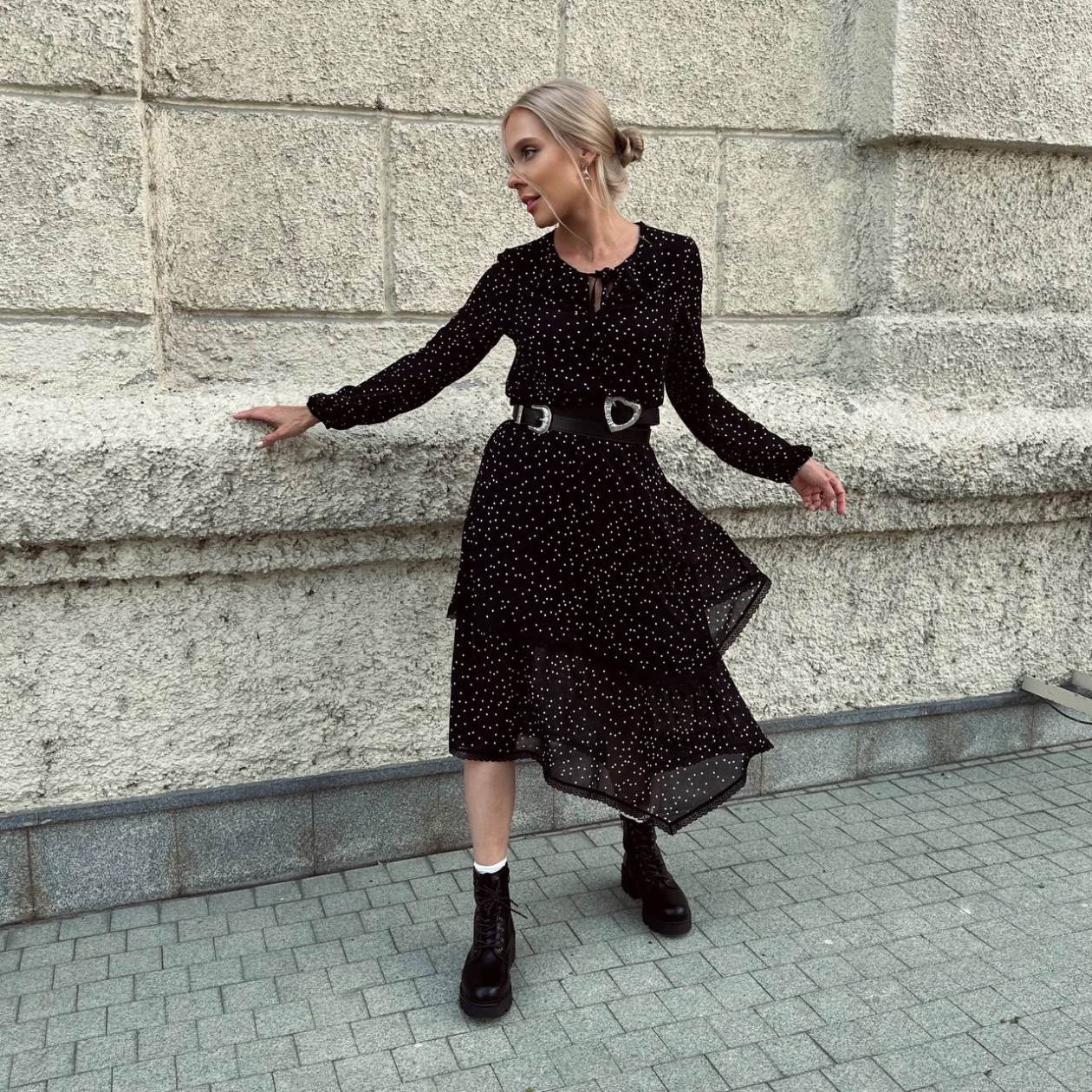 Рената Литвинова, принцесс Диана и Моника Белуччи. Это неполный список звезд, которые обожают платья в мелкий горошек. Предлагаем дополнить этот список вашим именем. Платье в длине миди. Ткань слегка просвечивает. Убка в 2 слоя, подол ассиметричный, оформлен ярусами. Тонкие завязки в зоне декольте.
