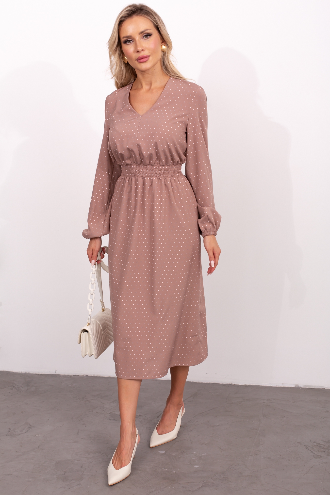 Красивое платье приталенного силуэта. V - образная горловина на внутренней обтачке. Длинный втачной рукав, по низу присборен на эластичную резинку. Модель отрезная по линии талии. По талии проложена эластичная резинка в несколько рядов, что дополнительно подчеркнет Ваш силуэт. Низ ровный, без разрезов.
