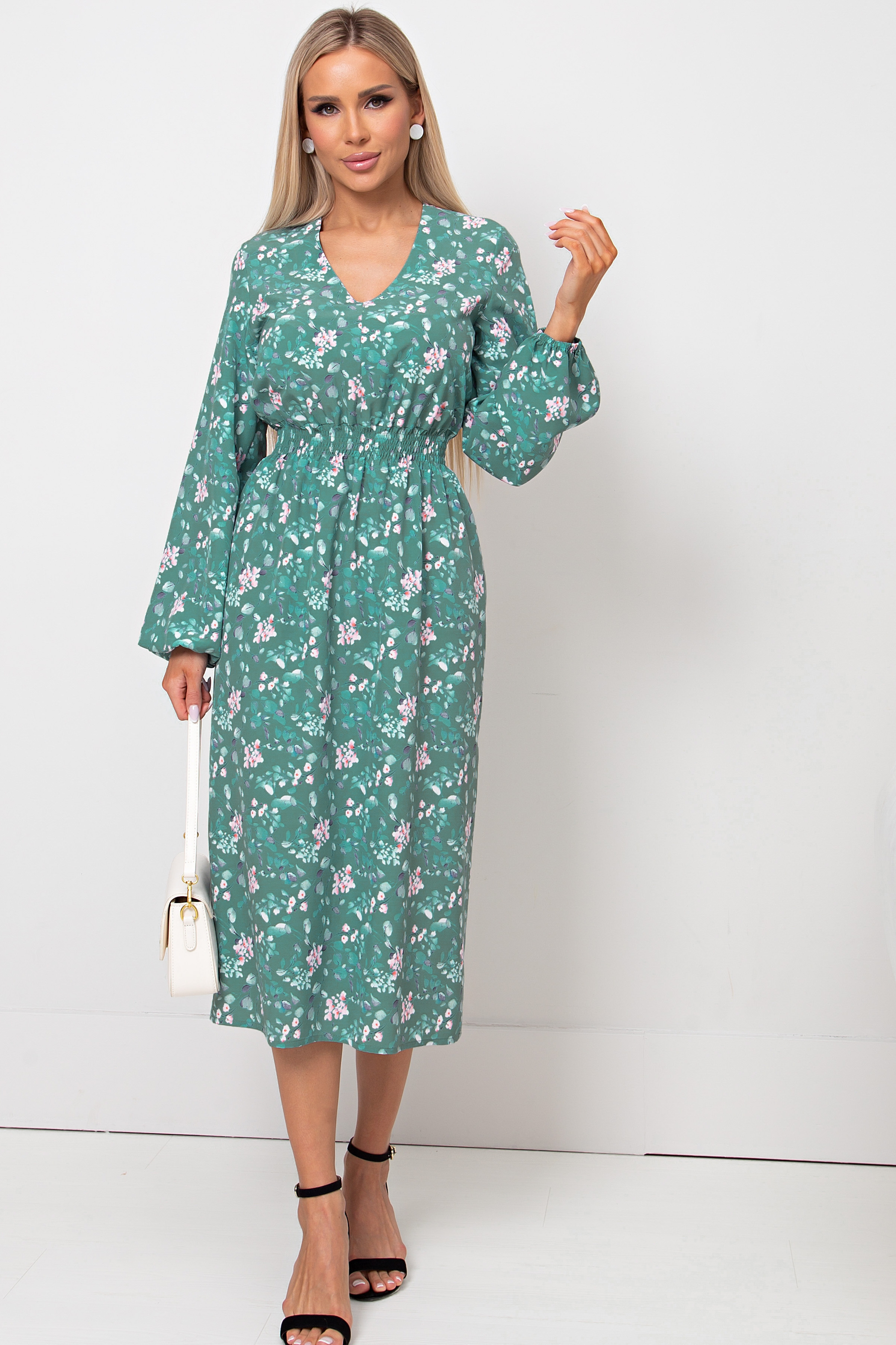 Красивое платье приталенного силуэта. V - образная горловина на внутренней обтачке. Длинный втачной рукав, по низу присборен на эластичную резинку. Модель отрезная по линии талии. По талии проложена эластичная резинка в несколько рядов, что дополнительно подчеркнет Ваш силуэт. Низ ровный, без разрезов.