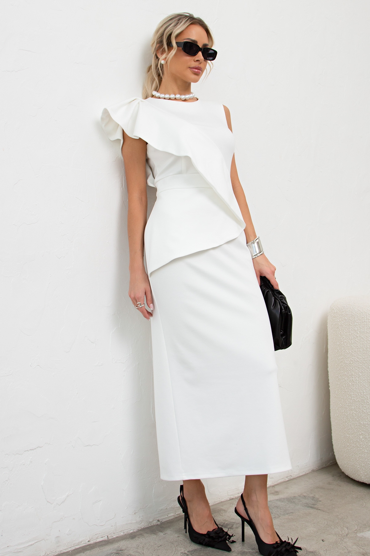 Перед юбки оформлен баской, переходящей по диагонали в волан, через плечо на спинку. Низ ровный, Сзади разрез.