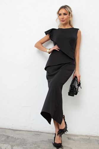 Перед юбки оформлен баской, переходящей по диагонали в волан, через плечо на спинку. Низ ровный, Сзади разрез.