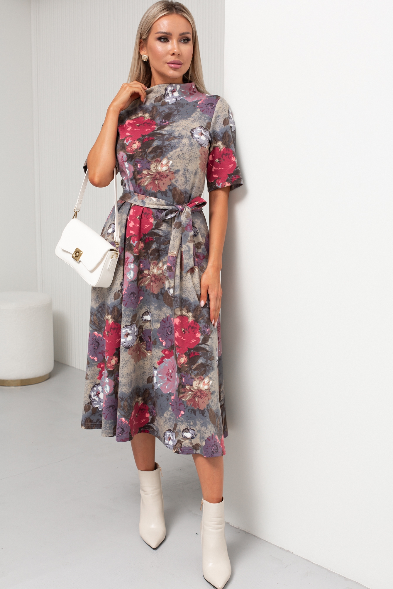 Элегантное платье приталенного силуэта выполнено из трикотажного полотна. Короткий втачной рукав. Горловина оформлена цельнокроеной стойкой, по спинке застежка на потайную молнию. Модель отрезная по линии талии. Юбка расклешенного силуэта. По переду и по спинке пущены мягкие встречные складки. Низ ровный, без разрезов. Тканевый пояс дополнительно акцентирует талию. Пояс из основного материала в комплекте.