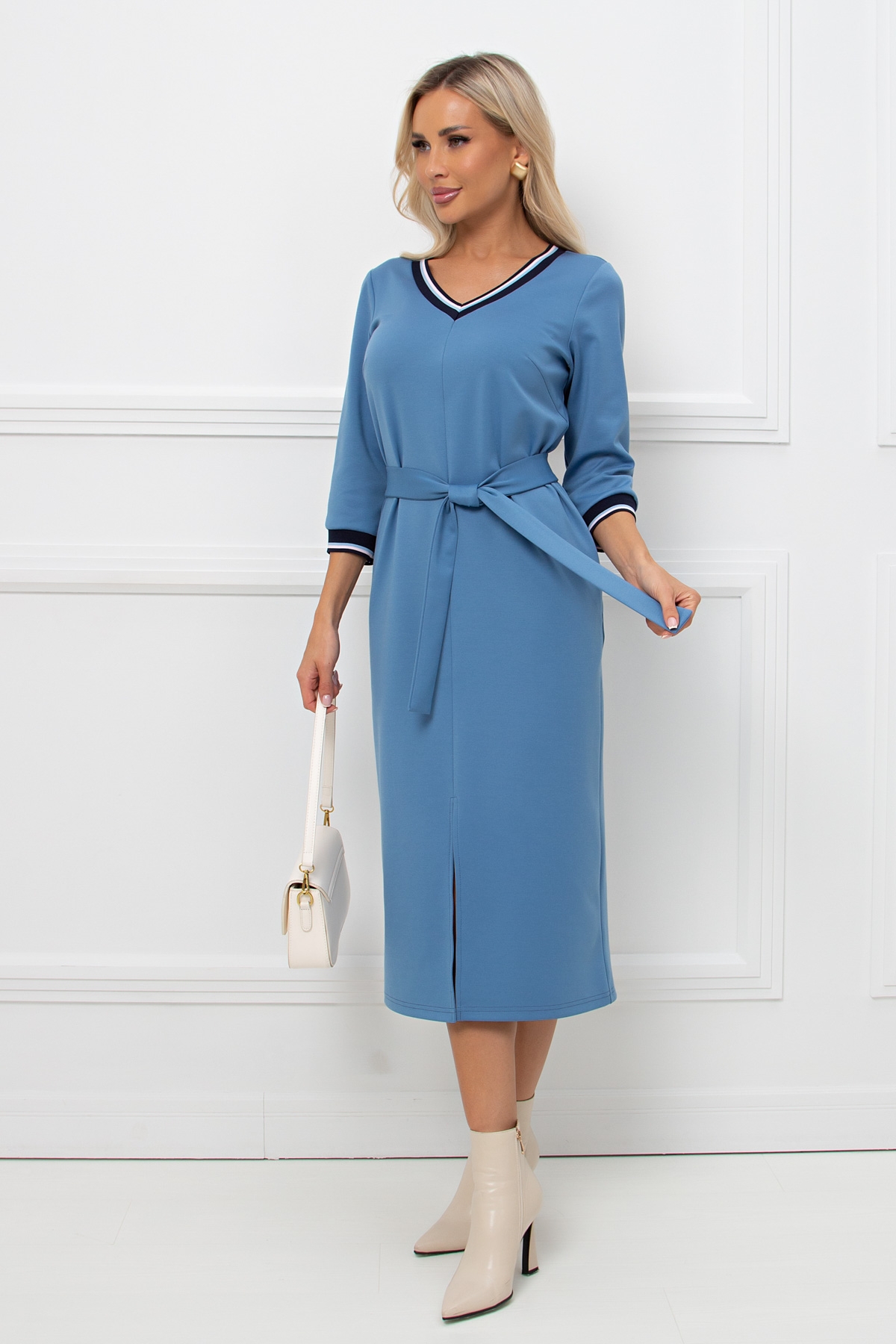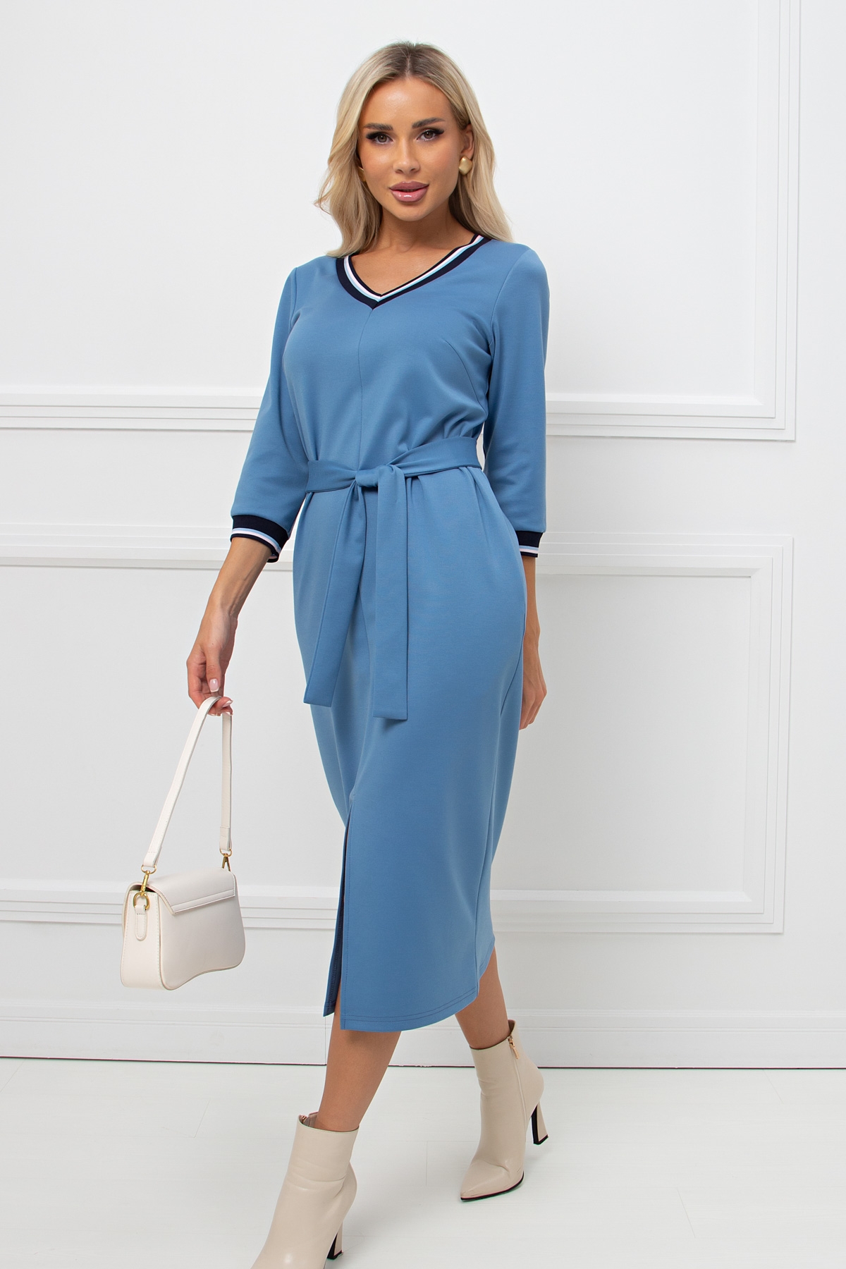 Комфортное платье прямого силуэта из плотного трикотажного полотна. V - образная горловина, втачной рукав длинной 3/4. В боковых швах функциональные карманы. Низ ровный, по переду разрез.