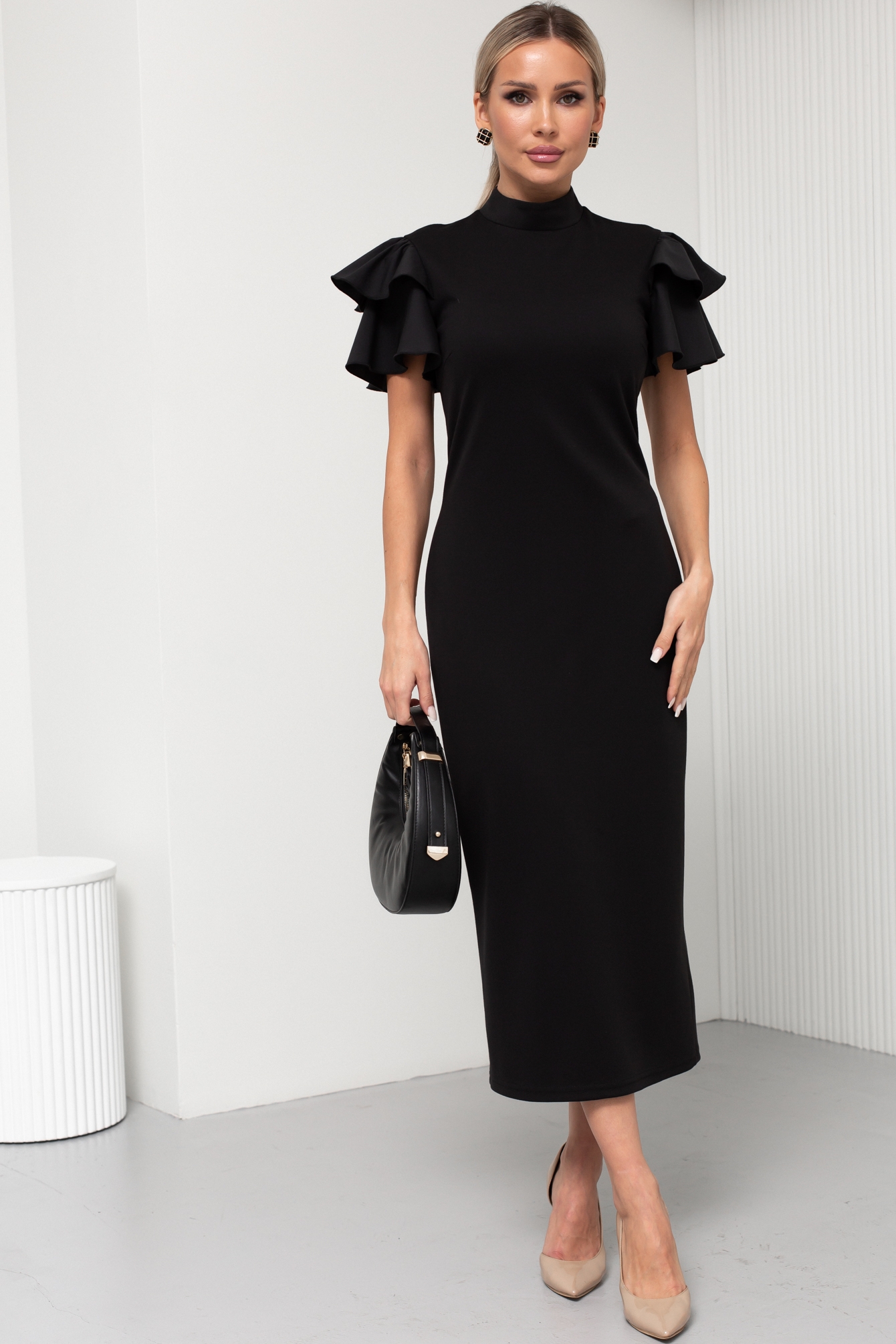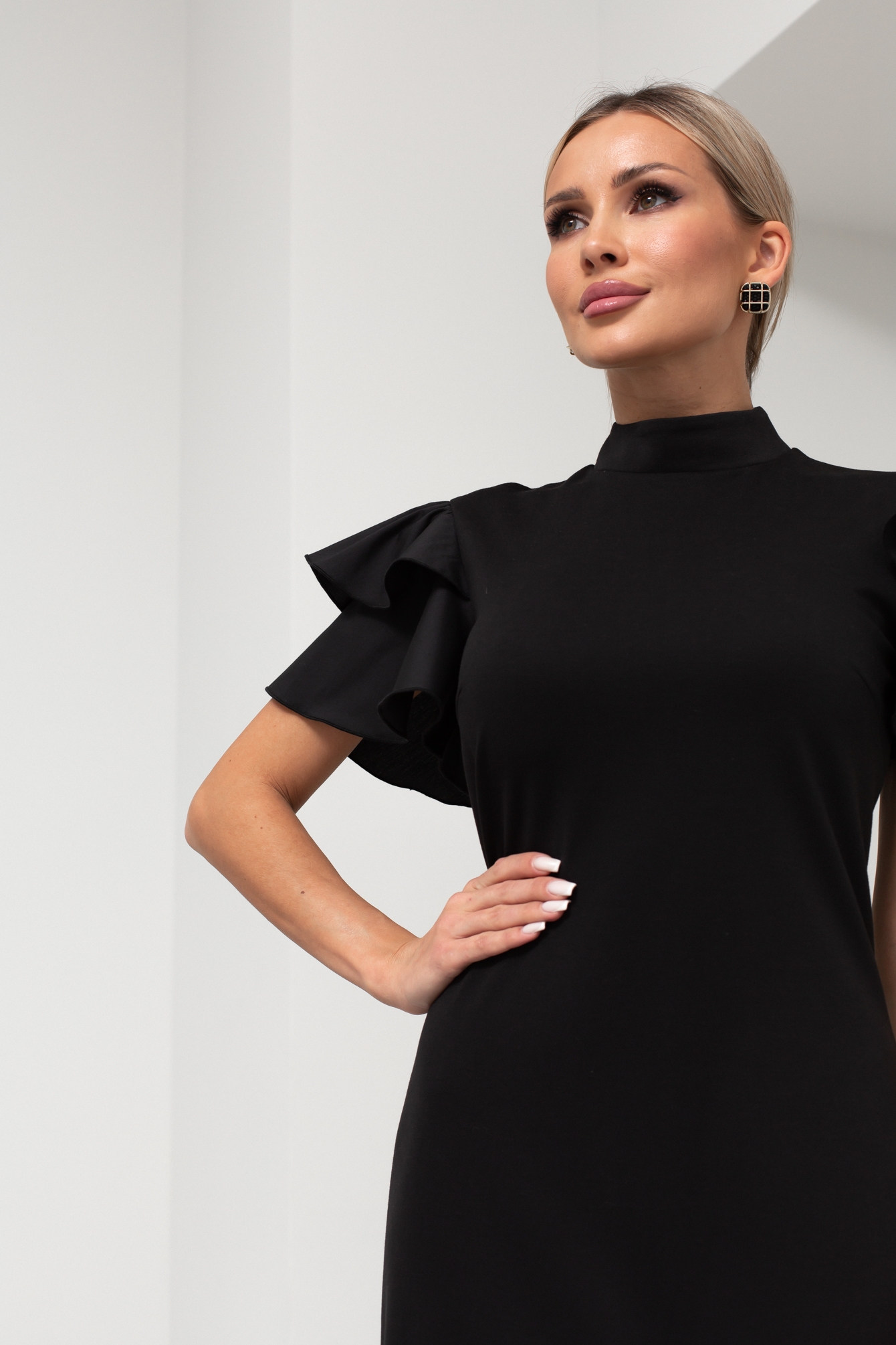 Элегантное платье прилегающего силуэта выполнено из однотонного трикотажного полотна. Горловина оформлена воротником - стойка. По среднему шву спинки застежка на потайную ленту - молнию. Короткие рукава - крылышки выполнены из хлопка. Низ ровный, сзади разрез.