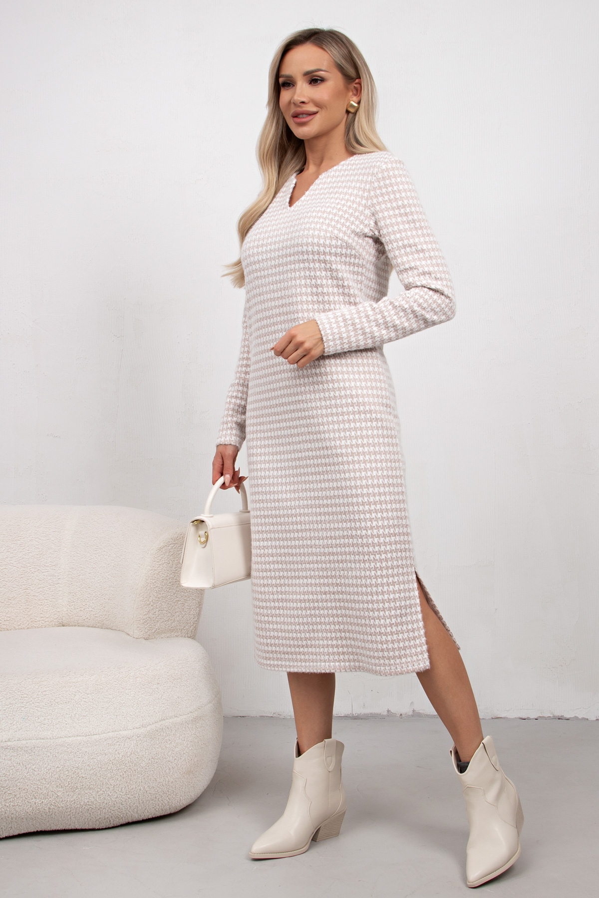 Комфортное платье прямого силуэта выполнено из трикотажного полотна "Ангора". Фигурная горловина на внутренней обтачке. Длинный втачной рукав. Низ ровный, по бокам разрезы.