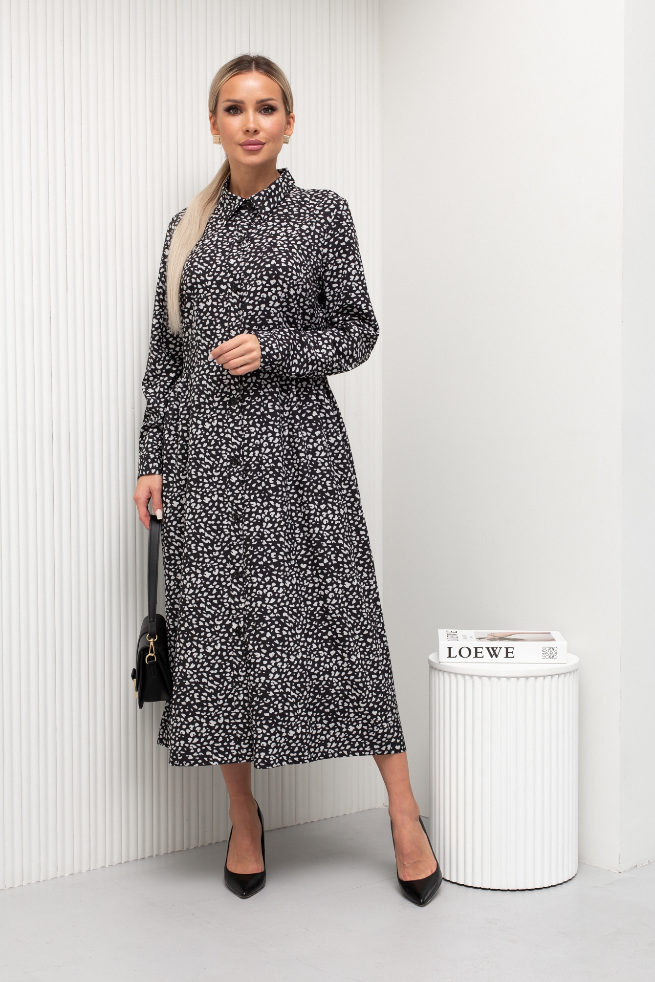 Комфортное платье приталенного силуэта из легкой ткани Ниагара. Горловина оформлена отложным воротником на стойке. По переду выполнена планка с застежкой на петли и пуговицы. Длинный втачной рукав оканчивается притачной манжетой. Модель отрезная по линии талии присборена на сборку. Низ ровный, без разрезов.