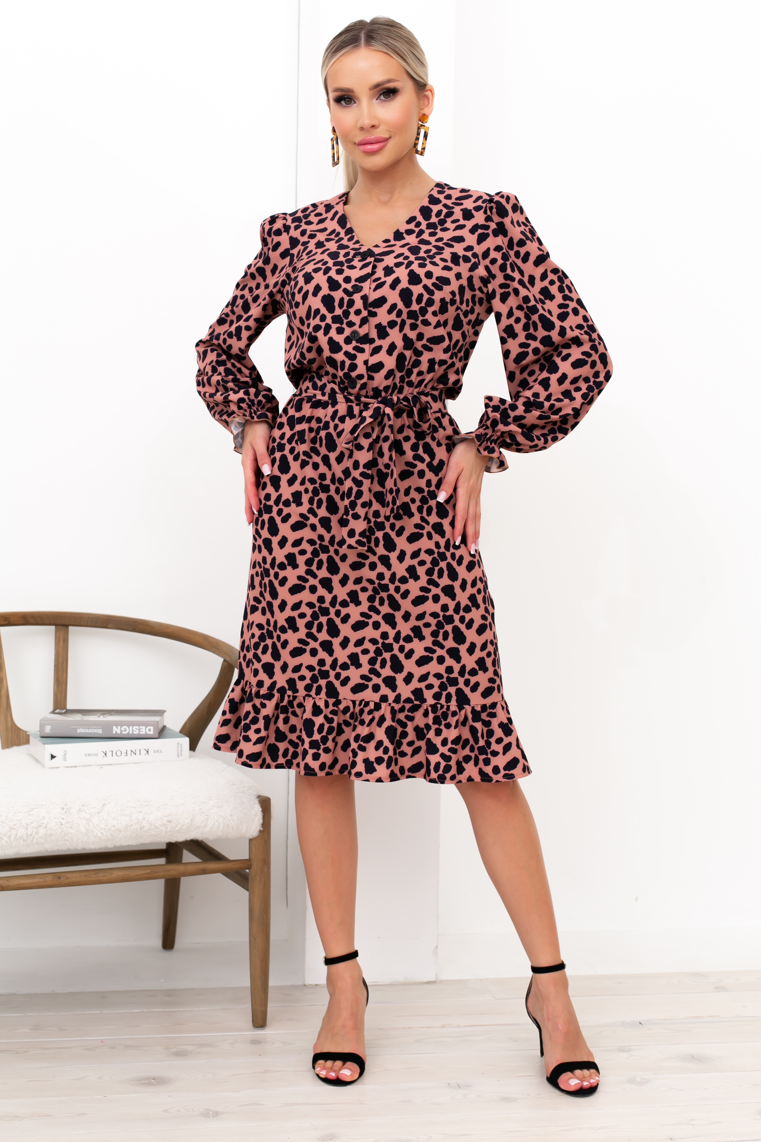 Женственное платье приталенного силуэта. V - образная горловина на внутренней обтачке переходящей в планку с застежкой на петли и пуговицы. Длинный втачной рукав присборен на резинку. Модель отрезная по линии талии, на резинке. Низ оформлен воланом. Пояс из основного материала в комплекте.