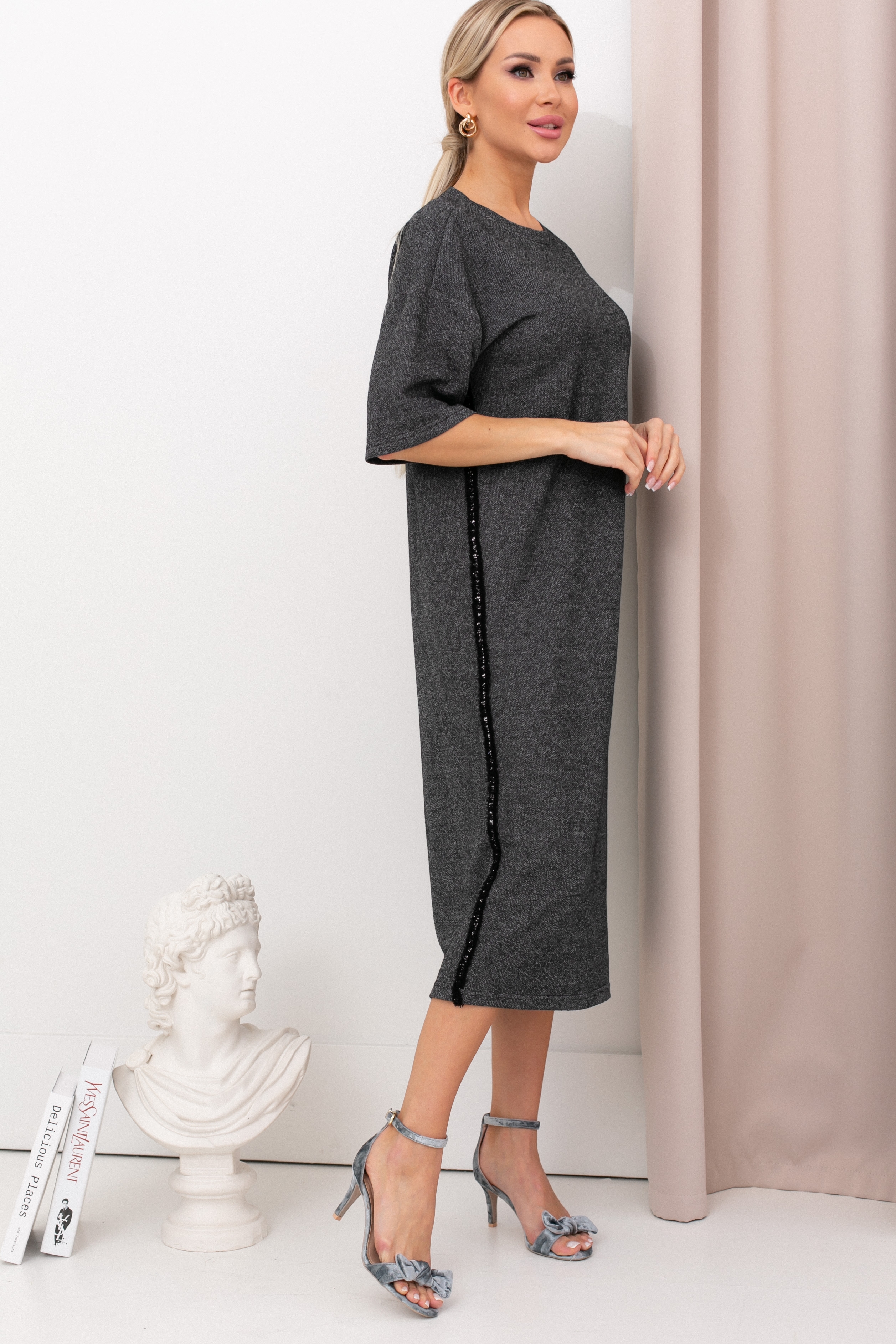 Удобное трикотажное платье прямого силуэта со спущенным коротким рукавом. Круглая горловина на внутренней обтачке. Боковые швы декорированы тесьмой. Модель без застежки.