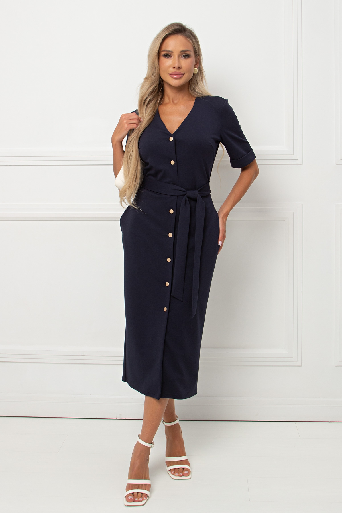 Повседневное платье полуприлегающего силуэта из трикотажного полотна .Короткий втачной рукав с отворотом по низу .V- образная горловина на внутренней обтачке переходящая в планку с застежкой на петли и  пуговицы. В боковых швах функциональные карманы . Низ ровный , без разрезов. Пояс из основной ткани в комплекте.