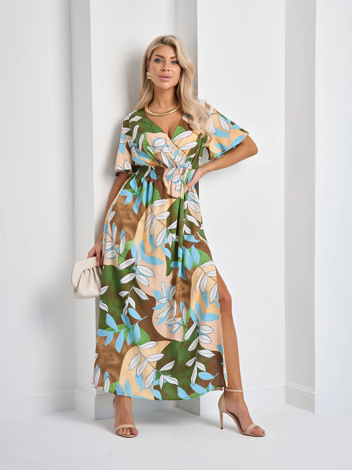 Легкое платье с коротким расклешенным рукавом.