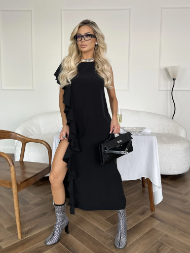 Перед  и спинка с одной стороны изделия декорированы пришивным воланом,  который  мягко ложится на плечо  и имитирует рукав.