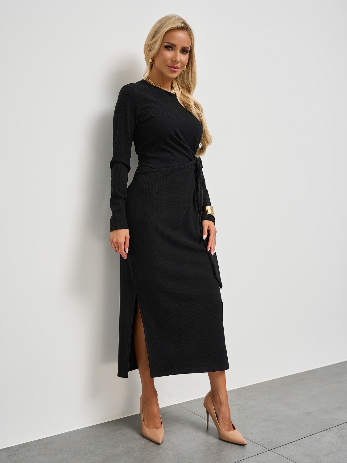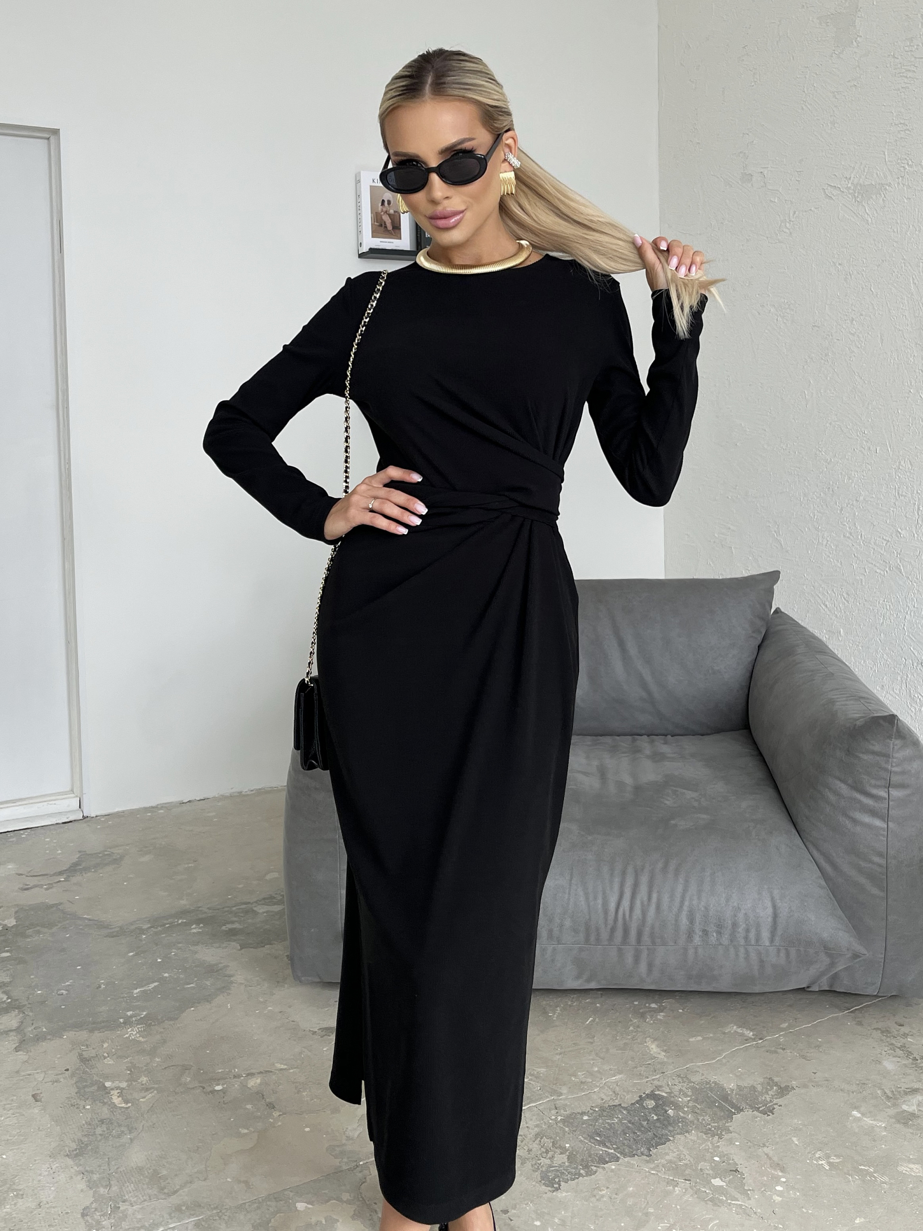 Трикотажное платье прилегающего силуэта длины миди.