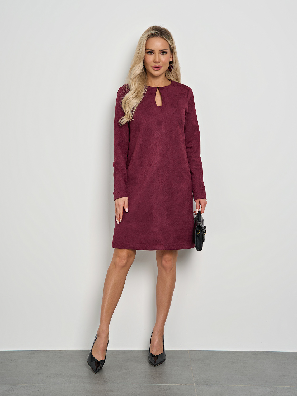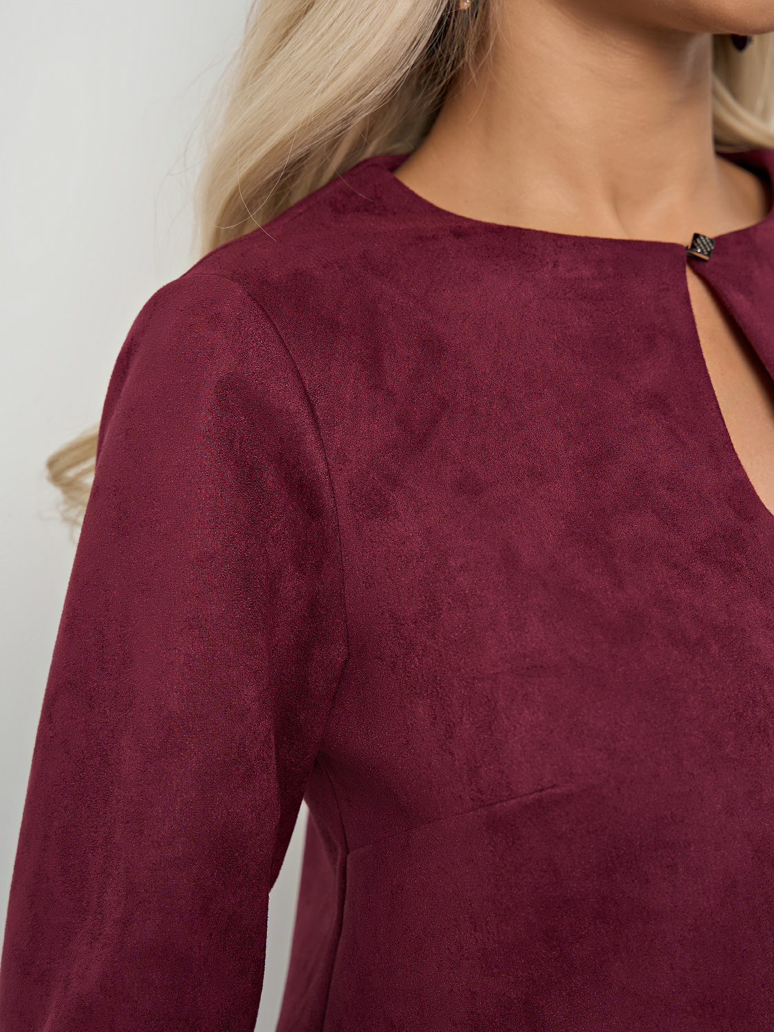 В верхней части переда расположен разрез в виде капли, который фиксируется застежкой на петлю и пуговицу.