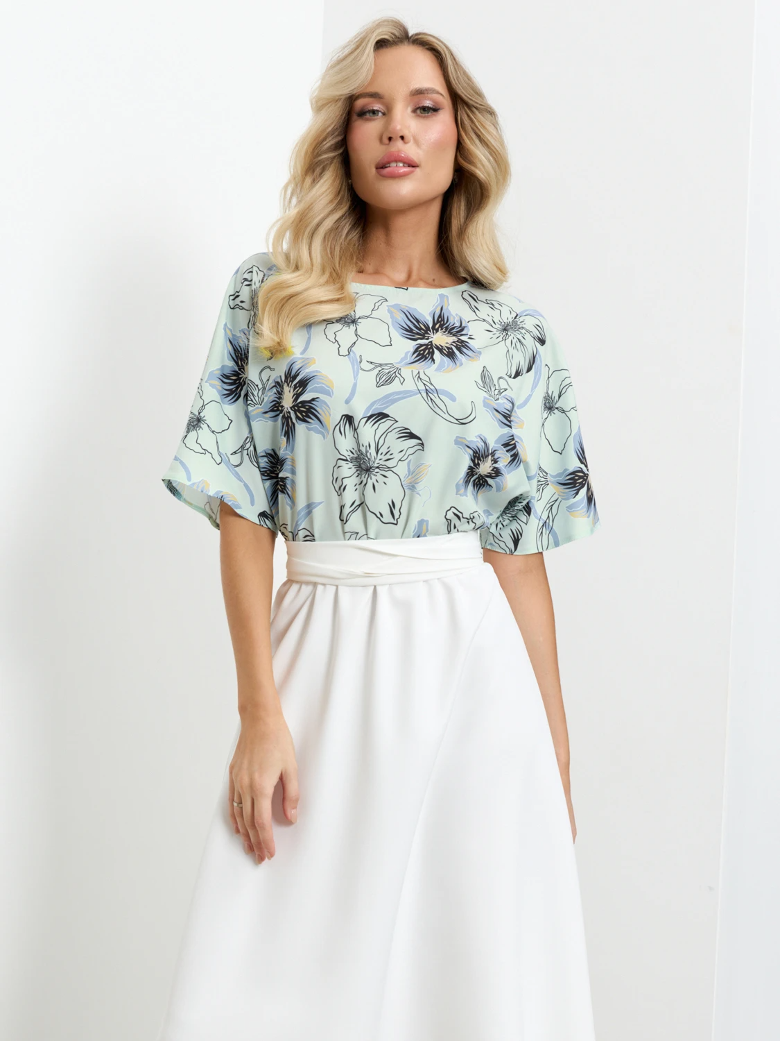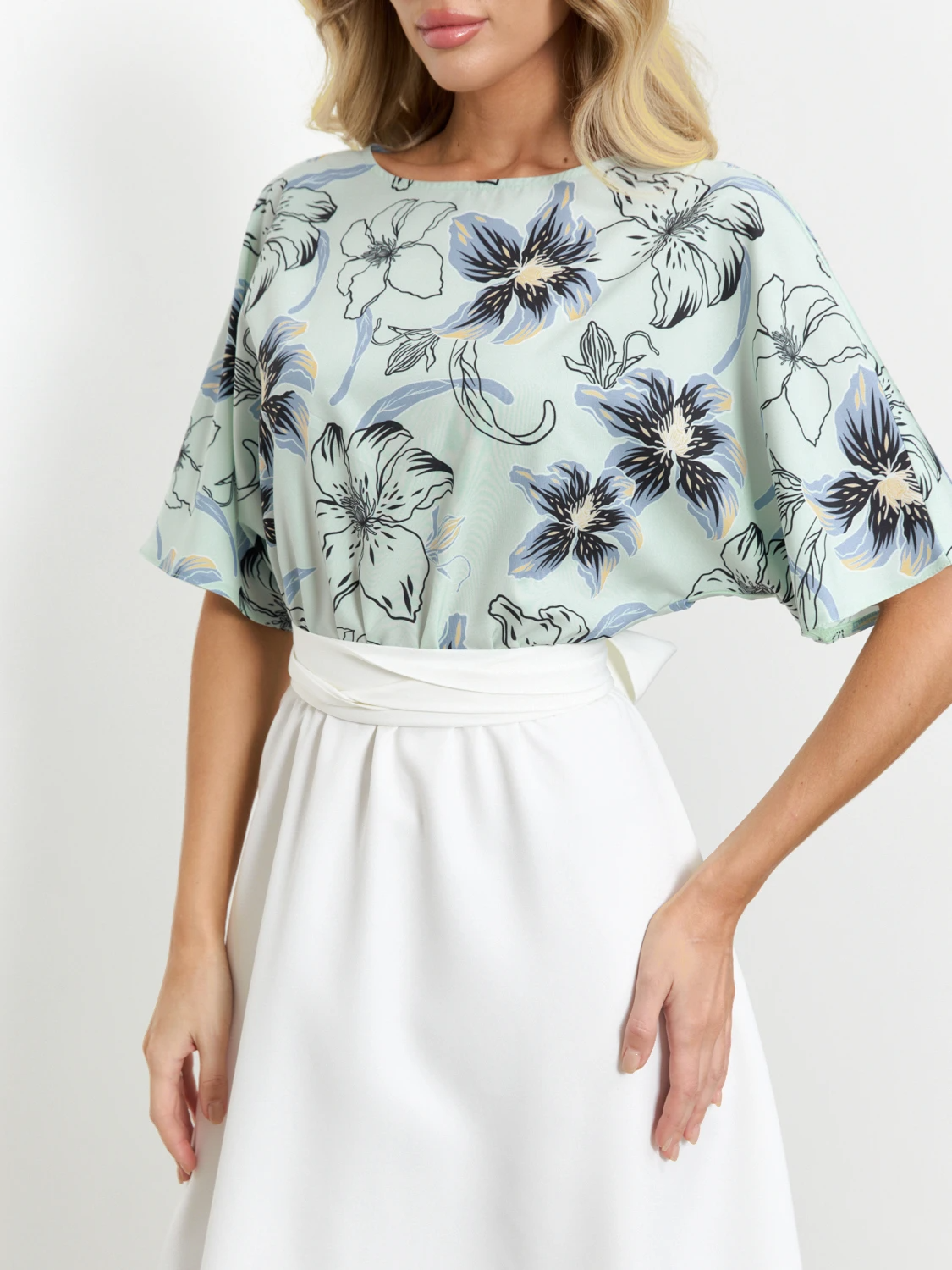 Верх выполнен из плательной ткани с принтом, низ и пояс из однотонной костюмной ткани.