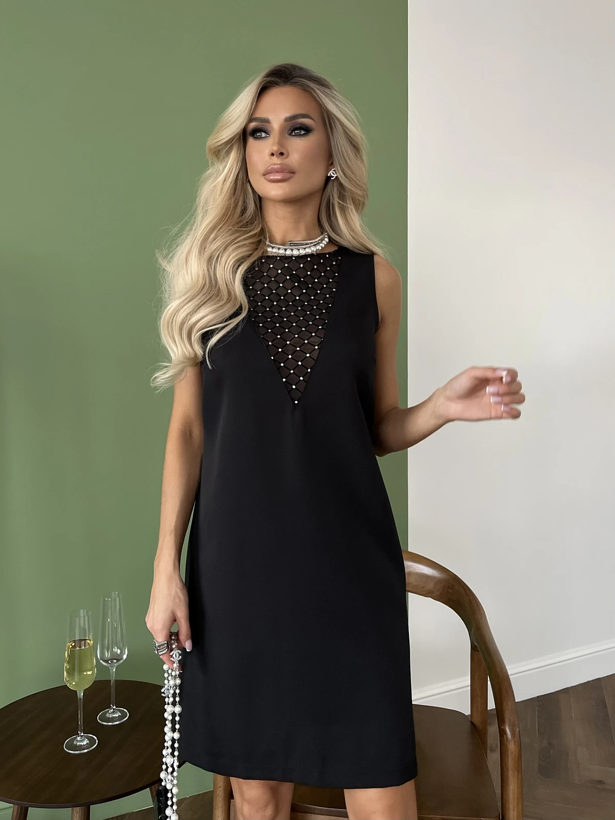 V-образный вырез горловины декорирован сеткой с блестками.