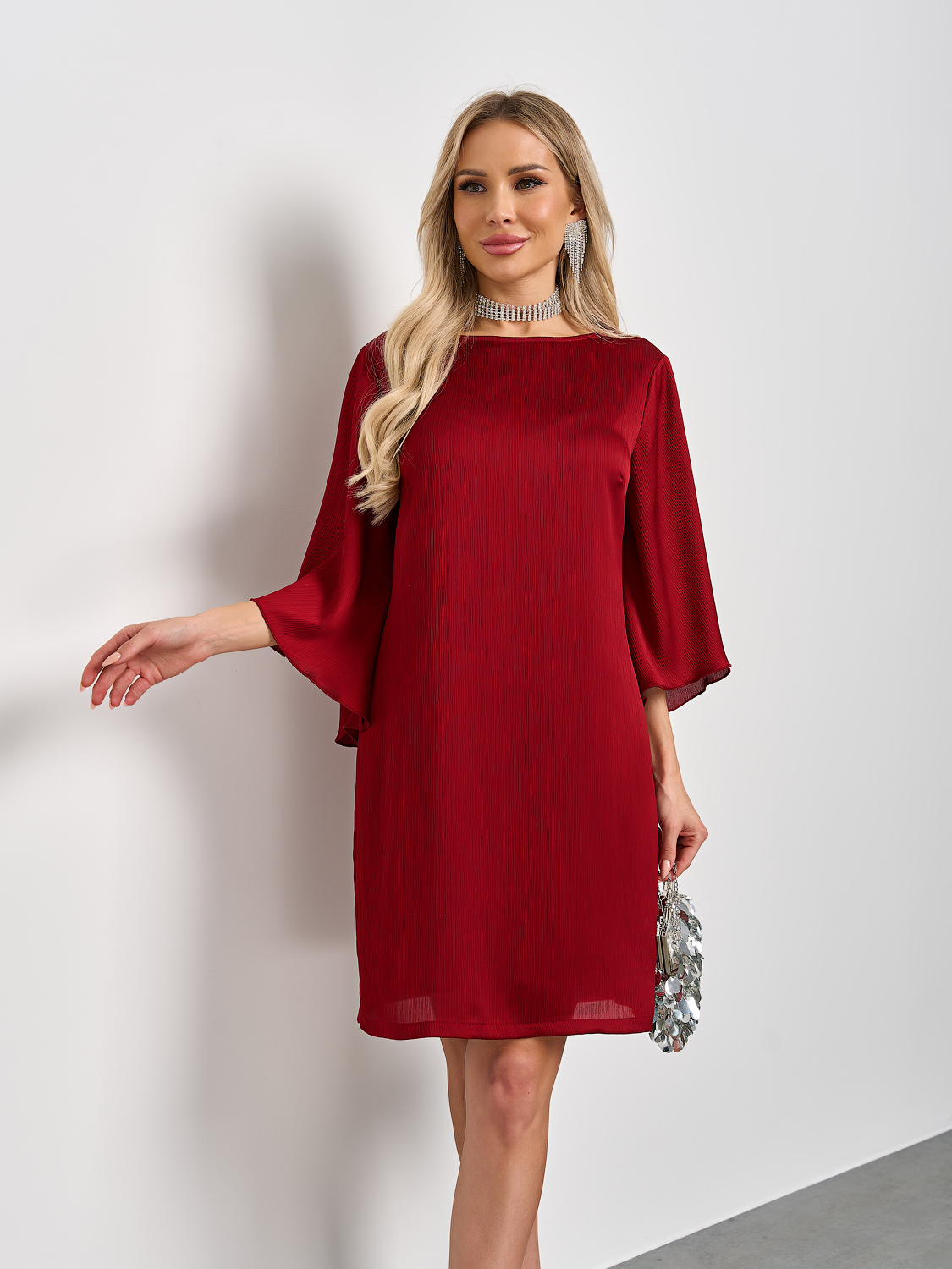 Стильное платье прямого силуэта из жатого шифона с подкладом в насышенном винном оттенке.