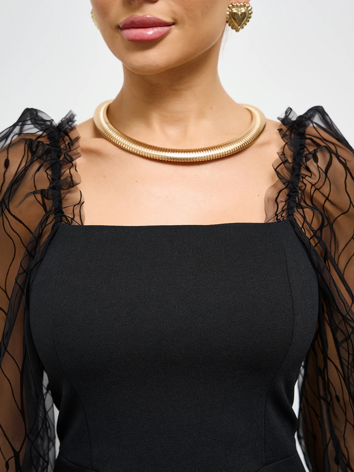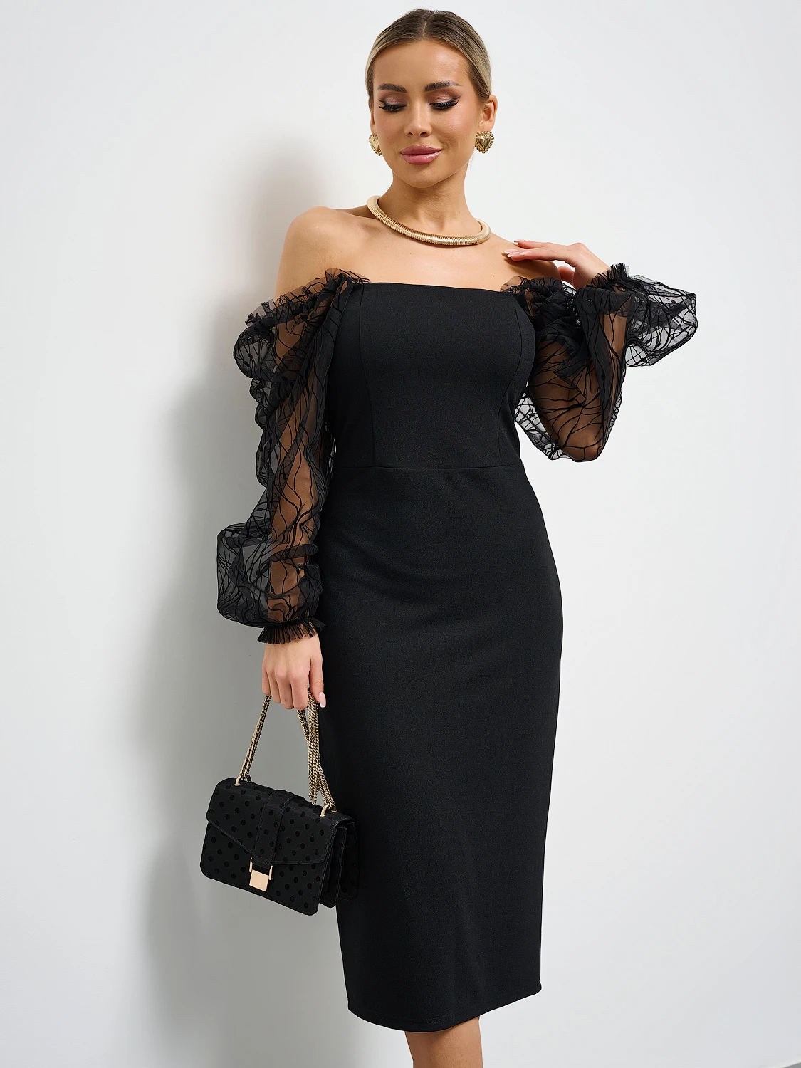 Платье из трикотажа,  отрезное по линии талии,  с рельефным верхом. Рукава выполнены из сетки с рисунком.