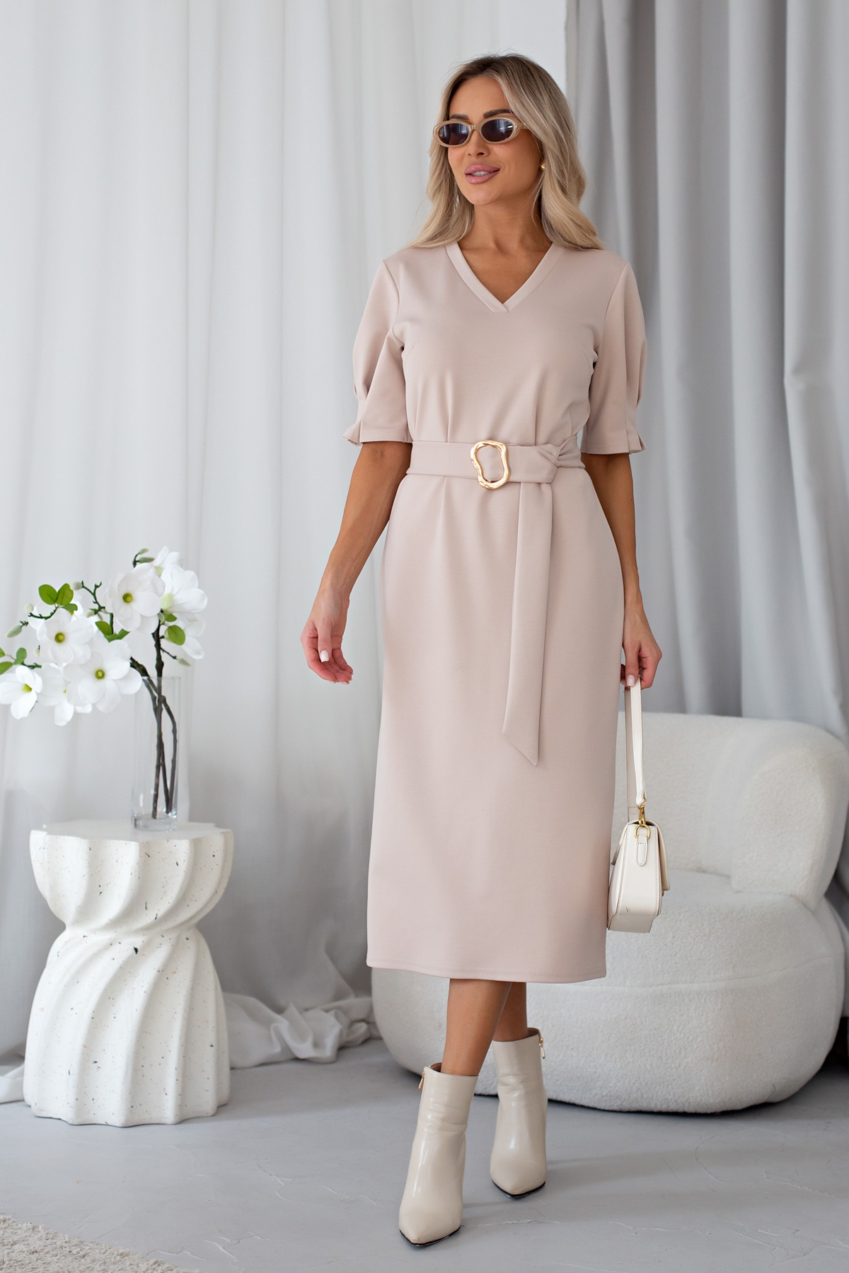 Лаконичное платье полуприлегающего силуэта изготовлено из трикотажного полотна.V-образная горловина. Короткий втачной рукав оформлен с встречными складками. Низ ровный, по спинке шлица. Пояс из основной ткани в комплекте.