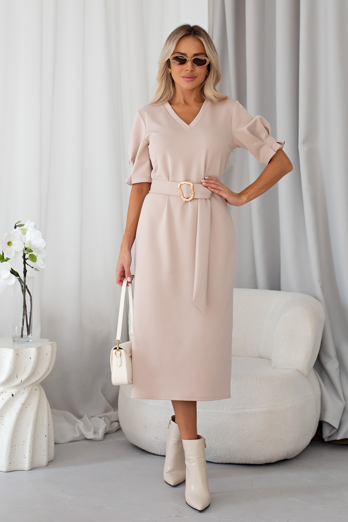 Лаконичное платье полуприлегающего силуэта изготовлено из трикотажного полотна.V-образная горловина. Короткий втачной рукав оформлен с встречными складками. Низ ровный, по спинке шлица. Пояс из основной ткани в комплекте.